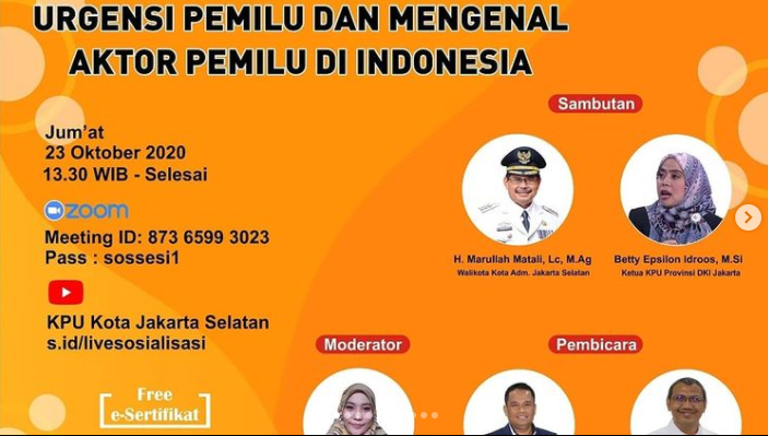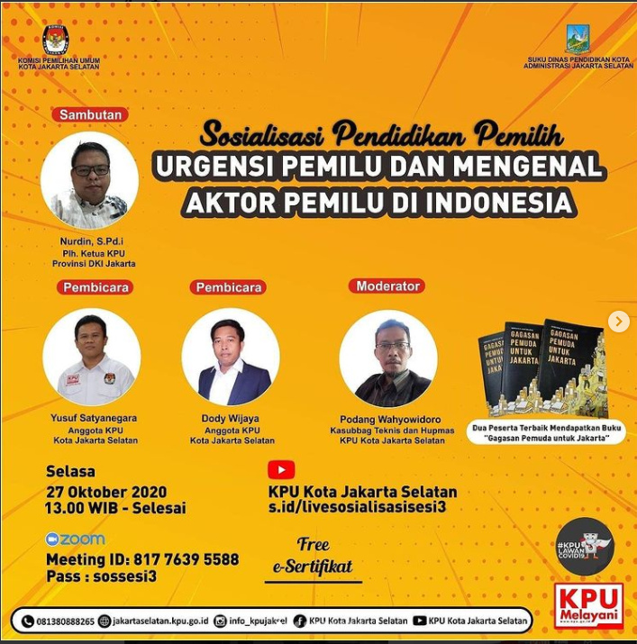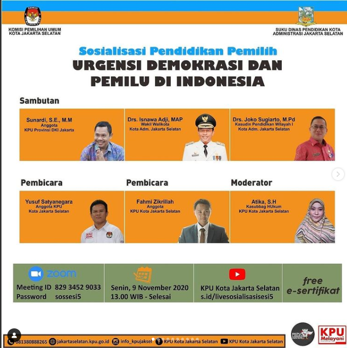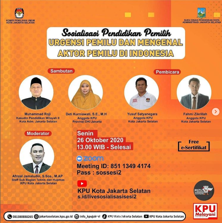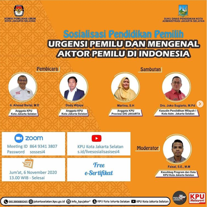 Jakarta Selatan, Jum'at 6 November 2020 KPU Kota Jakarta Selatan untuk keempat kalinya menyelenggarakan sosialisasi pendidikan pemilih sekaligus sosialisasi portal pemutakhiran data pemilih secara virtual. Sosialisasi ini merupakan hasil kerjasama Divisi Teknis dan Hupmas KPU Kota Jakarta Selatan dengan Suku Dinas Pendidikan Kota Administrasi Jakarta Selatan. Kegiatan sosialisasi pendidikan pemilih secara virtual sesi IV ini dibuka oleh Ketua KPU Kota Jakarta Selatan, Bapak Agus Sudono. Dalam sambutannya Agus Sudono menyampaikan apresiasi setinggi tingginya kepada seluruh panitia dan peserta yang telah berpartisipasi pada kegiatan sosialisasi pendidikan pemilih secara virtual ini, apresiasi tersebut tidak terlepas dari tingginya jumlah peserta yang mencapai 600 lebih peserta, belum lagi peserta yang mengikuti kegiatan sosialisasi pendidikan pemilih sesi IV ini melalui YouTube KPU Kota Jakarta Selatan. Hal ini merupakan sesuatu pencapaian yang patut diberi apresiasi ucap Agus Sudono di sela sela sambutannya. Beliau berharap semoga materi mengenai Kepemiluan ini dapat bermanfaat bagi seluruh peserta khususnya para pelajar. Kegiatan sosialisasi pendidikan pemilih secara virtual ini juga dihadiri oleh Ibu Marlina selaku Komiskkner KPU Provinsi DKI Jakarta yang mewakili ketua KPU Provinsi DKI Jakarta. Pada kesempatan ini Ibu Marlina menyampaikan sambutannya kepada seluruh peserta sosialisasi pendidikan pemilih secara virtual tersebut. Dalam sambutannya Ibu Marlina memberikan apresiasi yang sangat tinggi kepada panitia dan seluruh peserta yang hadir. Beliau menyampaikan bahwa jumlah peserta pada sosialisasi pendidikan pemilih secara virtual kali ini merupakan peserta dengan jumlah yang cukup tinggi. Beliau juga berterima kasih kepada suku dinas pendidikan kota administrasi Jakarta Selatan yang sudah mengkoordinasikan sekolah sekolah SMA/SMK sederajat yang berada di wilayah kota Jakarta Selatan untuk ikut serta dalam kegiatan sosialisasi hari ini. Sambutan juga diberikan oleh Drs. Joko Sugiarto M.Pd, selaku Ka Sudin Pendidikan wilayah I Kota Administrasi Jakarta Selatan.