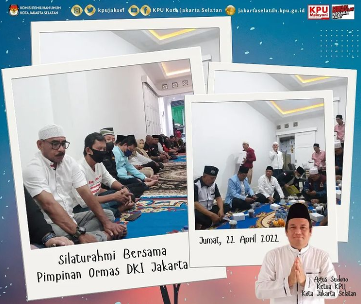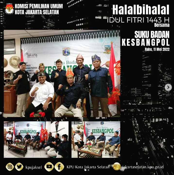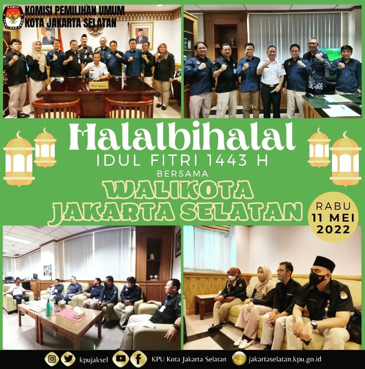 Jakarta Selatan, Rabu (11/5) Ketua Komisi Pemilihan Umum Kota Jakarta Selatan bersama rombongan, menghadiri undangan Halalbihalal Idul Fitri 1443 H bersama Walikota dan Sekretaris Kota Administrasi Jakarta Selatan. Dalam pertemuan ini Ketua Komisi Pemilihan Umum Kota Jakarta Selatan mengucapkan Minal Aidin Wal Faizin dan ini sangat positif, banyak hal yang kita bisa kolaborasikan. Sebab, kita tidak bisa kerja sendiri untuk mensukseskan program, tahapan dan Jadwal Pemilu Serentak 2024 yang akan dimulai dalam beberapa bulan kedepan. Agus Sudono juga menyampaikan bahwa suksesnya Pemilu Serentak pada Tahun 2019 di Kota Administrasi Jakarta Selatan adalah hasil kerjasama dan sinergiritas kuat antara Komisi Pemilihan Umum Kota Jakarta Selatan, Walikota Kota Administrasi Jakarta Selatan dan stakeholder terkait, sehingga perlu untuk terus dibina, dikembangkan dan sustainable demi kelancaran dan suksesnya Pemilu Serentak Tahun 2024.