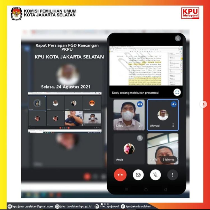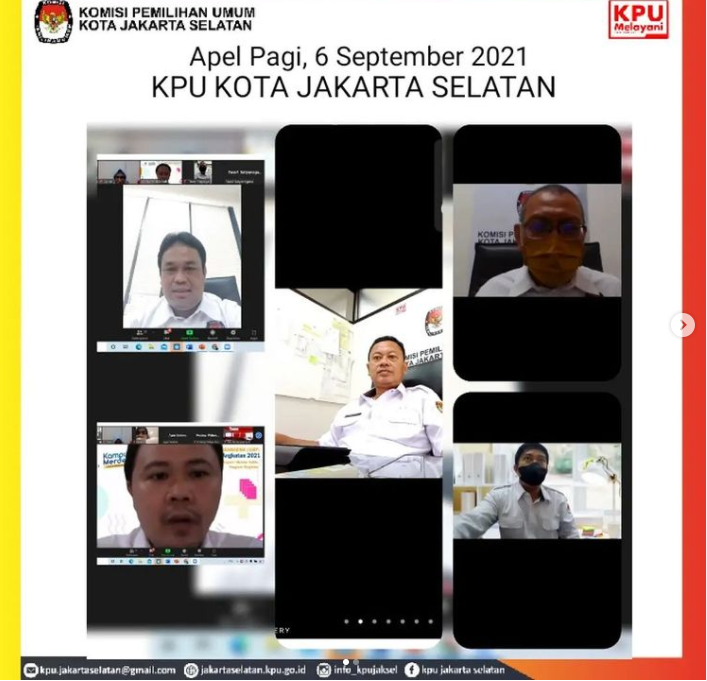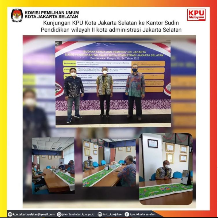 Jakarta Selatan, 2 September 2021 Ketua KPU kota Jakarta Selatan, Bapak Agus Sudono bersama Bapak Ahmad Barizi selaku Komisioner KPU Kota Jakarta Selatan divisi data pemilih beserta staf mengunjungi kantor Suku Dinas Pendidikan wilayah II kota administrasi Jakarta Selatan. Kunjungan kerja tersebut diterima langsung oleh Bapak Sarwoko selaku Kasi Pendidikan Menengah Suku Dinas Pendidikan wilayah II kota administrasi Jakarta Selatan.
