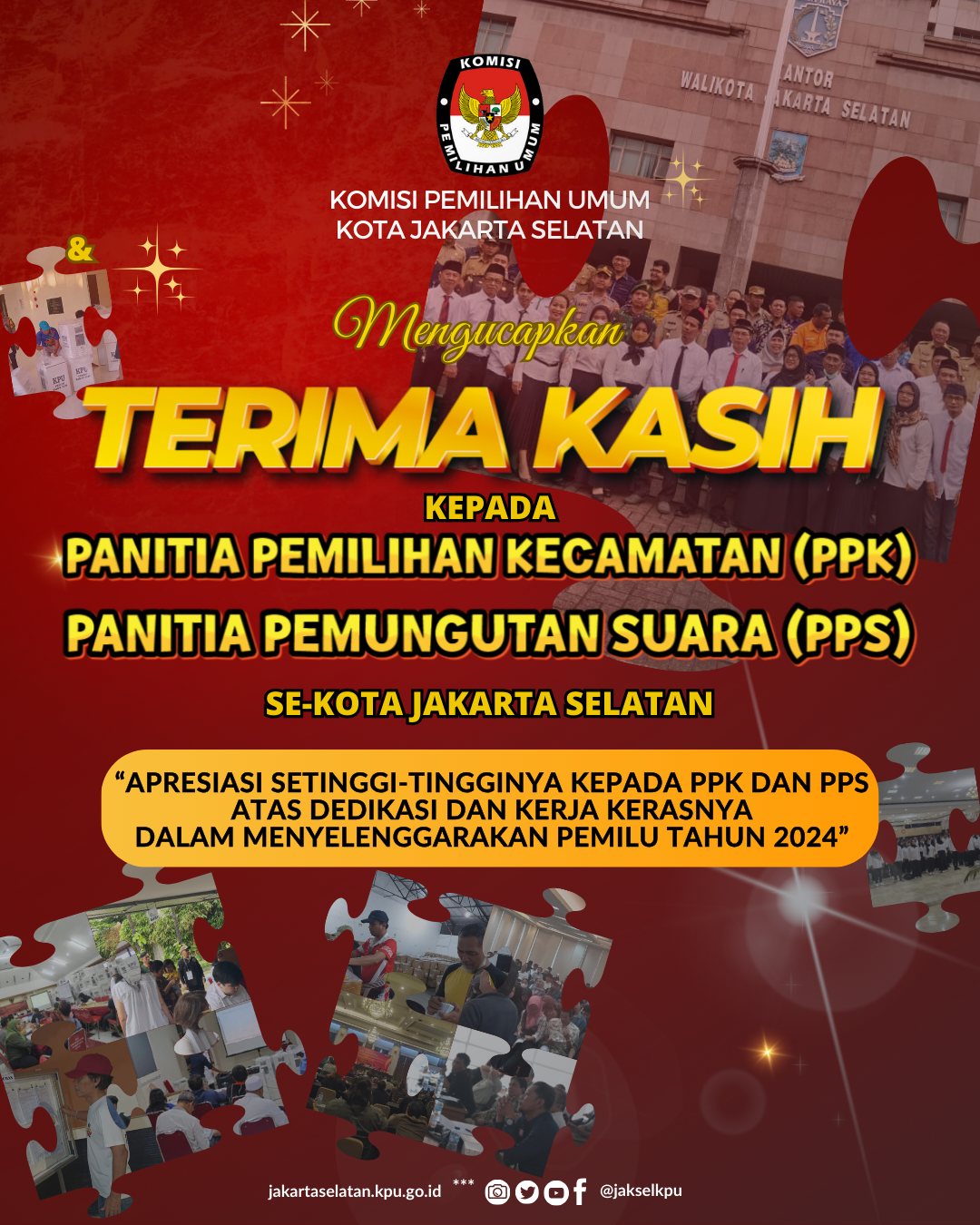 KPU Kota Jakarta Selatan mengadakan Acara Rapat Koordinasi Persiapan Pembentukan Kelompok Penyelenggara Pemungutan Suara (KPPS) pada tanggal 10 Desember 2023 di Swiss-Belresidences Rawajati, Pancoran, Jakarta Selatan. Acara dibuka oleh Anggota KPU Provinsi DKI Jakarta Dody Wijaya didampingi oleh Ketua KPU Kota Jakarta Selatan Muhammad Taqiyuddin, Anggota KPU Kota Jakarta Selatan Ali Akbar B dan Yusuf Pasaribu, serta Sekretaris KPU Kota Jakarta Selatan Danny M. M. Pora. Acara diikuti oleh Jajaran Sekretariat KPU Kota Jakarta Selatan, Ketua dan Anggota PPS dari 65 Kelurahan se-Kota Jakarta Selatan. Hadir sebagai Narasumber Kepala Bagian Pemerintahan Kota Administrasi Jakarta Selatan Manaek Fernando, Kepala Suku Badan Kesbangpol Kota Administrasi Jakarta Selatan Dirhamul Nugraha dan Kepala Seksi Kepala Seksi Pelayanan Kesehatan Suku Dinas Kesehatan Kota Administrasi Jakarta Selatan dr. Dwi Sujadir.