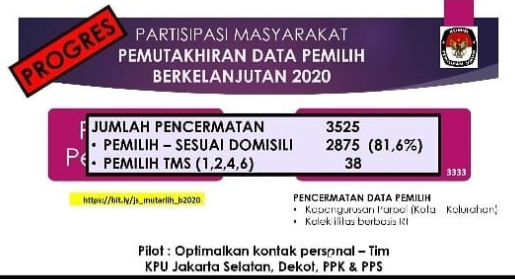 Jakarta Selatan, Selasa, 16 Februari Tahun 2021 KPU Kota Jakarta Selatan kembali menyelenggarakan Rapat Koordinasi Pemutakhiran Data Pemilih Berkelanjutan pada bulan Februari tahun 2021. Rapat Pleno terkait pemutakhiran data pemilih berkelanjutan ini diselenggarakan sebagai tindak lanjut dari SE KPU RI No: 181/PL-02.I-SD/01/KPU/II/2020. Perihal pemutakhiran data pemilih berkelanjutan tahun 2020, yang diterbitkan tanggal 28 Februari 2020. Dalam surat Edaran tersebut KPU Kab/Kota wajib menyelenggarakan rapat koordinasi dan rapat pleno pemutakhiran data pemilih berkelanjutan secara rutin pada tiap bulan. Dalam rapat pleno pemutakhiran data pemilih berkelanjutan bulan Februari tahun 2021 dan sekaligus rapat pleno yang ke 11 ini, KPU Kota Jakarta Selatan dalam hal ini diwakilkan oleh Ketua KPU kota Jakarta Selatan, Bapak Agus Sudono memutuskan sekaligus menetapkan total jumlah pemilih per tanggal 16 Februari tahun 2021 di wilayah Kota Jakarta Selatan adalah sebanyak 1.702.791 pemilih terdiri dari 843.912 pemilih laki-laki dan 858.879 pemilih perempuan. Bersama kita sukseskan tahapan pemutakhiran data pemilih berkelanjutan di wilayah kota Jakarta Selatan.
